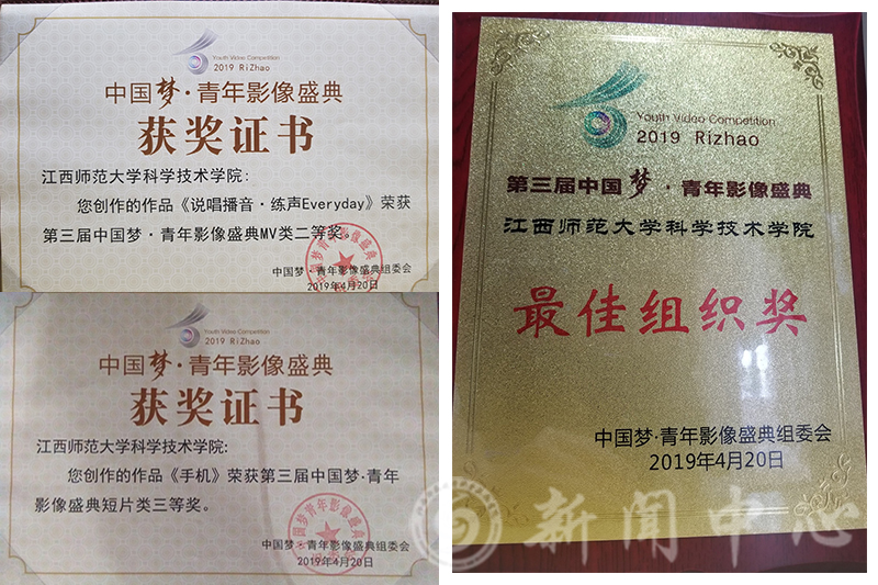 近日,2019第三届“中国梦·青年影像盛典”在山东日照落幕,全国112所高校、44个影视工作室参加本次活动,我院传媒学院2017级播音与主持艺术专业蔡明、吴思宁、蔡闽源、黄浩然、廖思杰的《说唱播音·练声Every day》和2017级影视摄影与制作专业丁丹丹、嵇宏才、梁杰、何俊的《手机》,从4700余部作品中脱颖而出,分别获得MV类全国二等奖和短片类全国三等奖,我院获“最佳组织奖”。