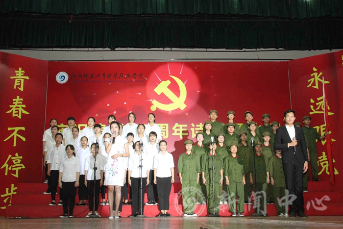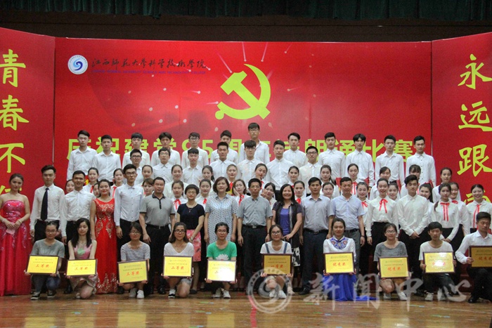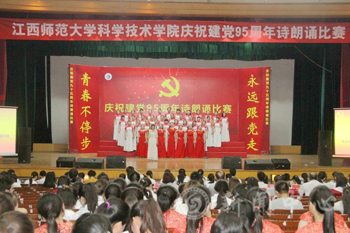 6月14日晚,学院庆祝建党95周年诗朗诵比赛在青山湖校区大礼堂举行。江西师范大学党委组织部部长詹鸿生、江西师范大学党校常务副校长侯桃、江西师范大学党委宣传部副部长王一喜、江西师范大学文学院党委副书记许靓静、江西师大科技学院副院长赵群应邀出席并担任评委,院长李斌,院党委书记程春泉,院党委副书记赖经洪,副院长汪剑与全院1000余名师生到场观看比赛。