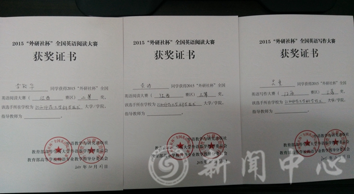 10月31日,2015“外研社杯”全国英语阅读大赛和写作大赛(江西省复赛)在九江学院举行,全省高校100多名优秀选手参加比赛。经过紧张激烈地角逐,我院获得二等奖1项,三等奖2项。其中,2014级英语教育李敏华同学荣获阅读大赛二等奖,2012级英语教育黄涛同学荣获阅读大赛三等奖,2012级英语教育吴童同学荣获写作大赛三等奖。