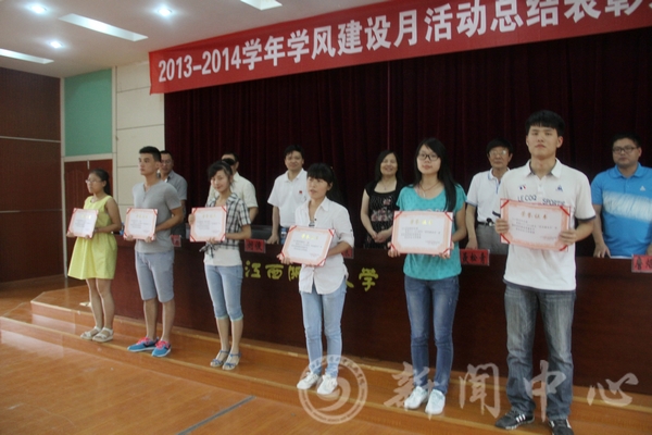 会上,学生事务管理中心负责人从工作开展情况、存在的问题与不足、改进措施及思考三个方面对2013—2014学年学风建设月活动进行了总结,聂松青宣读了2013—2014学年学风建设月活动表彰决定。在欢快的乐曲声中,在主席台就座的领导为获奖集体和个人一一颁奖。