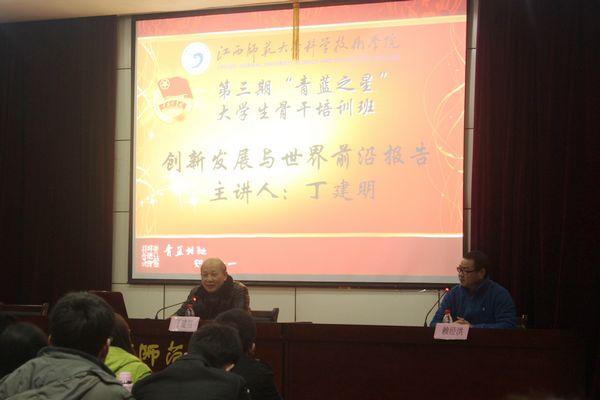 2月26日晚,我院第三期“青蓝之星”大骨班第四讲在双理楼二楼报告厅举行,中国演讲与口才协会副会长丁建明教授以“创新发展与世界前沿报告”为主题为我院大学生骨干培训班作了专题讲座。院办、院团委等部门负责人,辅导员和培训班学员参加了培训会。培训会由学院党委副书记赖经洪主持。