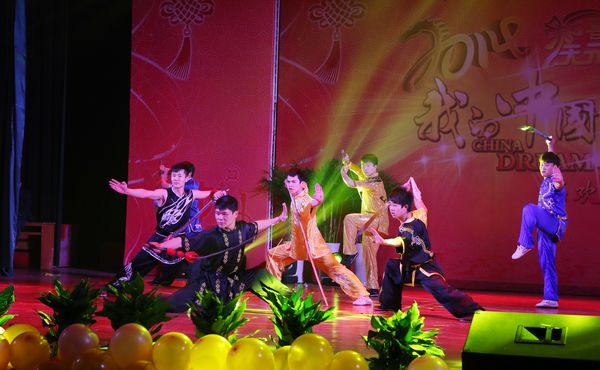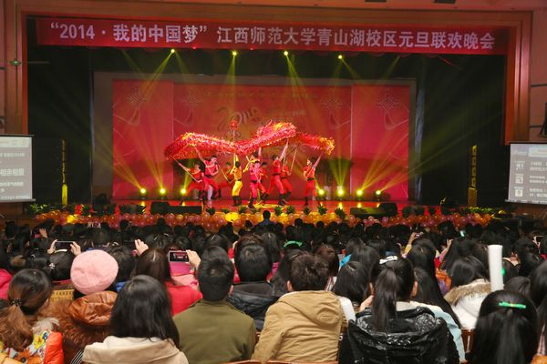 晚八点半,青山湖校区“2014·我的中国梦”主题元旦晚会在歌手大拜年中正式拉开帷幕,晚会共分为“春之韵,夏之恋,秋之味,冬之语”四个篇章。健美操、小提琴演奏、歌伴舞、爵士舞、民族舞、相声、小品、扇子舞、武术表演、舞龙舞狮等形式丰富、内容多彩的节目将晚会推向一次又一次高潮,给大家呈现了一场无与伦比的视听盛宴。