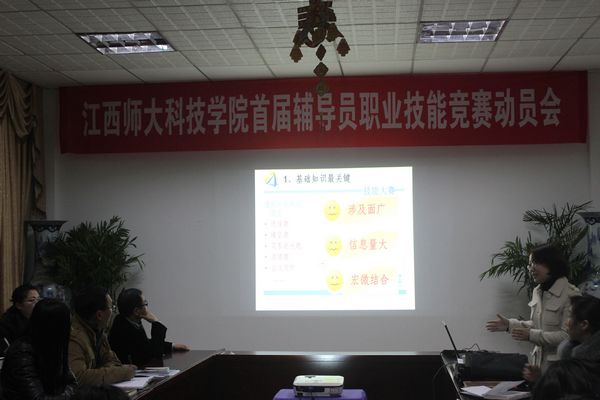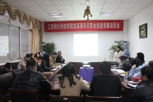 1月7日下午,我院首届辅导员职业技能竞赛动员会在双理楼一楼会议室召开,江西科技师大通信与电子学院团委书记、学工办主任罗燕老师应邀前来院介绍参赛经验。院党委副书记赖经洪出席动员会,学工各部门负责人及全体辅导员参加了会议。