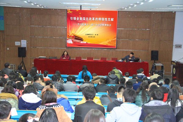 为了更好地学习贯彻党的十八届三中全会精神,12月17日下午,根据校党委统一安排和部署,院长刘俊教授作为学校首批理论宣讲员、学校“党的十八大精神宣讲团”成员、学校党的十八届三中全会精神宣讲员为学院全体教工和学生党员、学生骨干宣讲党的十八届三中全会精神,报告会由院党委书记程春泉主持。