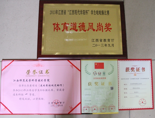 9月28日,由江西省教育厅主办的2013年“江西省现代学院杯”学生啦啦操大赛在江西师范大学举行,我院喜获全省“花球舞蹈规定动作”普通本科组一等奖、体育道德风尚奖。9月30日,由国家体育总局体操运动管理中心、中国大学生体育协会主办的2013年全国啦啦操联赛暨中国啦啦操之星争霸赛(南昌站)在江西师大举行,我院喜获大学组—花球规定动作第六名。