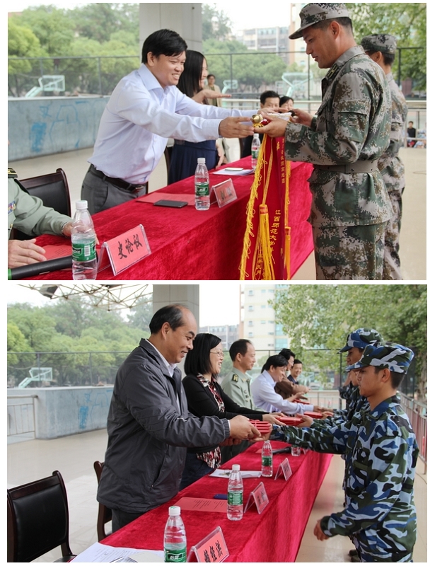 许红缨宣读了《关于表彰2013级新生军训先进集体和先进个人的决定》。一营一连(地理科学)等9个连队,罗莽等10名教官,魏娜等4名辅导员,李连坤等78名同学受到了表彰,出席大会的领导为受表彰的先进集体和个人颁奖。