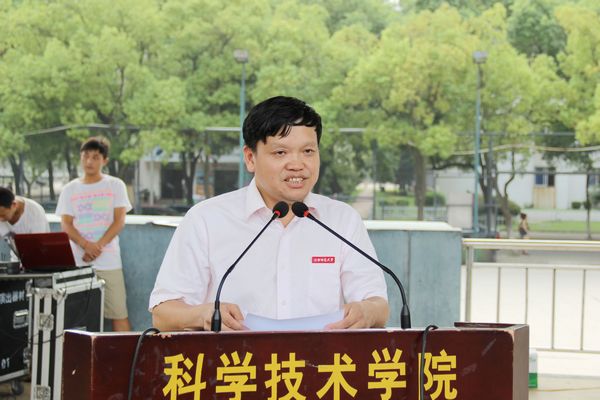 刘俊作了开学典礼致辞暨军训动员讲话。他首先代表学院新同学的到来表示欢迎和祝贺。在讲话中,他和大家分享了他对大学的理解。他认为大学就是学大,学着让你大起来。大学生在大学里,实际上就是学习四种东西,在大学里要学怎样读书,学怎样办事,学怎样处世,学怎样做人。一是要学怎样读书,那就是要学会学习,学会学习的方法;二是要学怎样做事,就是学做事方式,学做事求实效,学做事原则,做到知行合一;三是要学怎样处世,就是学会待人接物,应付世情,与世人相处交往;四是要学怎样做人,就是学会做个有志向的人,做个有信仰的人,做个有责任的任,做个智慧的人,做个善良的人,做个乐观的人,做个宽容的人,做个实在的人,做一个正直的人,做一个谨慎的人。对于今年的军训他提出了三点要求,一是向军人学习,严格要求自己,强化织纪律性和集体主义观念;二是要以饱满的热情,积极的态度投身到军事训练中去;三是要培养和锻炼坚强的意志品质,努力养成良好的学习、生活习惯。最后他表示,这所学校一定不会让你们失望,学院一定会点燃你们的激情,都会全心全意地为你们提供支持和服务,为你们的梦想插上腾飞的翅膀。