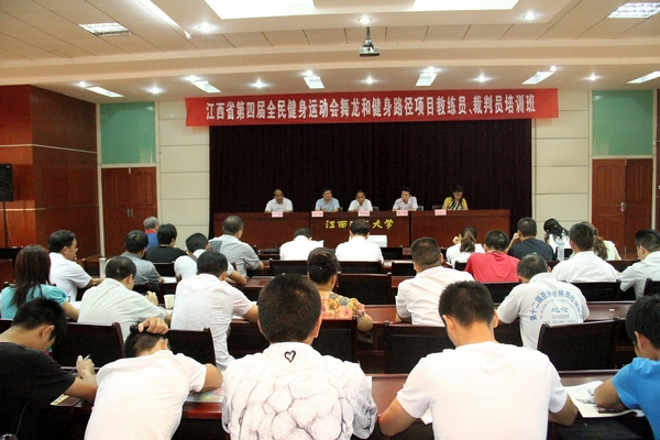 9月9日上午,全省第四届全民健身运动会舞龙和健身路径项目教练员、裁判员培训班在我院开班。省龙狮运动协会主席罗水保,省龙狮运动协会副主席、院长刘俊,省龙狮协会副主席、省体育局群体处副处长曾伟,省体育局群众体育处调研赵志力,副院长汪剑等出席开班仪式,来自全省近一百余全省第四届全民健身运动会舞龙和健身路径项目教练员、裁判员参加了开班仪式,开班仪式由赵志力主持。