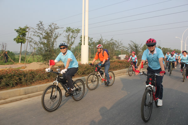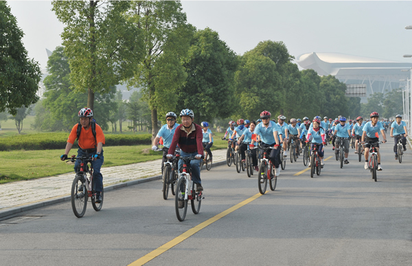 早上6时,在傅修延书记一声“出发”令下,全体骑行队员们浩浩荡荡的从青山湖校区红场出发,由此拉开自行车骑行重走校址路的序幕。当骑行队来到学院创办初期租赁江西省商业学校校址时,骑行队员们感受着学院创办时期在这里扬帆起航的风采;在青山湖畔和艾溪湖湿地公园,流淌的车队和美丽的西湖构成一道道绚丽的风景。在路途中,微风徐徐,骑行队员们们相互鼓励和照应,彼此交流骑行经验,不时呐喊加油,随时提醒注意安全,充分体现了学院师生良好的协作态度和互助精神。