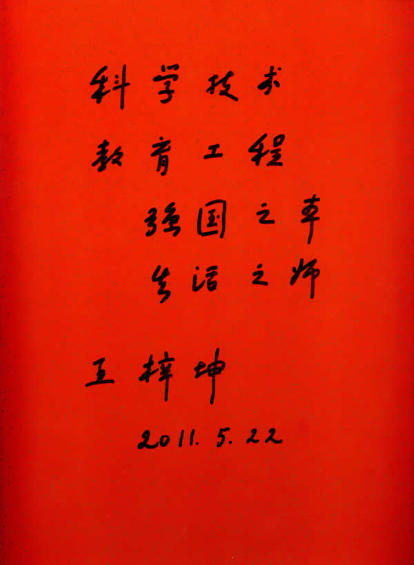 5月22日,中科院院士、我院名誉院长王梓坤教授为院庆题词。王梓坤院士为院庆题写了“科学技术,教育工程,强国之本,生活之师”,充分表达了王梓坤院士对教育的重视,表明了对学院的发展寄予厚望。