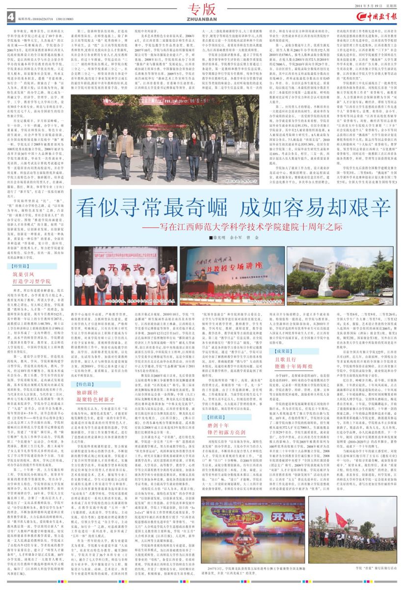 值此我院庆祝建院十周年之际,社会各界给予了高度关注。5月19日中国教育报以《看似寻常最奇崛,成如容易却艰辛——写在江西师范大学科学技术学院建院十周年之际》为题,以整版方式,图文并茂的形式,对我院十年的办学历程进行了深度报道。(文/图 院办)