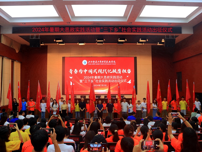 青春为中国式现代化挺膺担当。7月2日下午,学院2024年暑期大思政实践活动暨“三下乡”社会实践活动出征仪式在图书馆报告厅举行。院党委书记肖接增,副院长赖经洪、陈志丹,党委委员余小军、熊南菲出席仪式。有关部门和各教学党总支负责人,暑期社会实践队指导教师、队员等200余人参加仪式。
