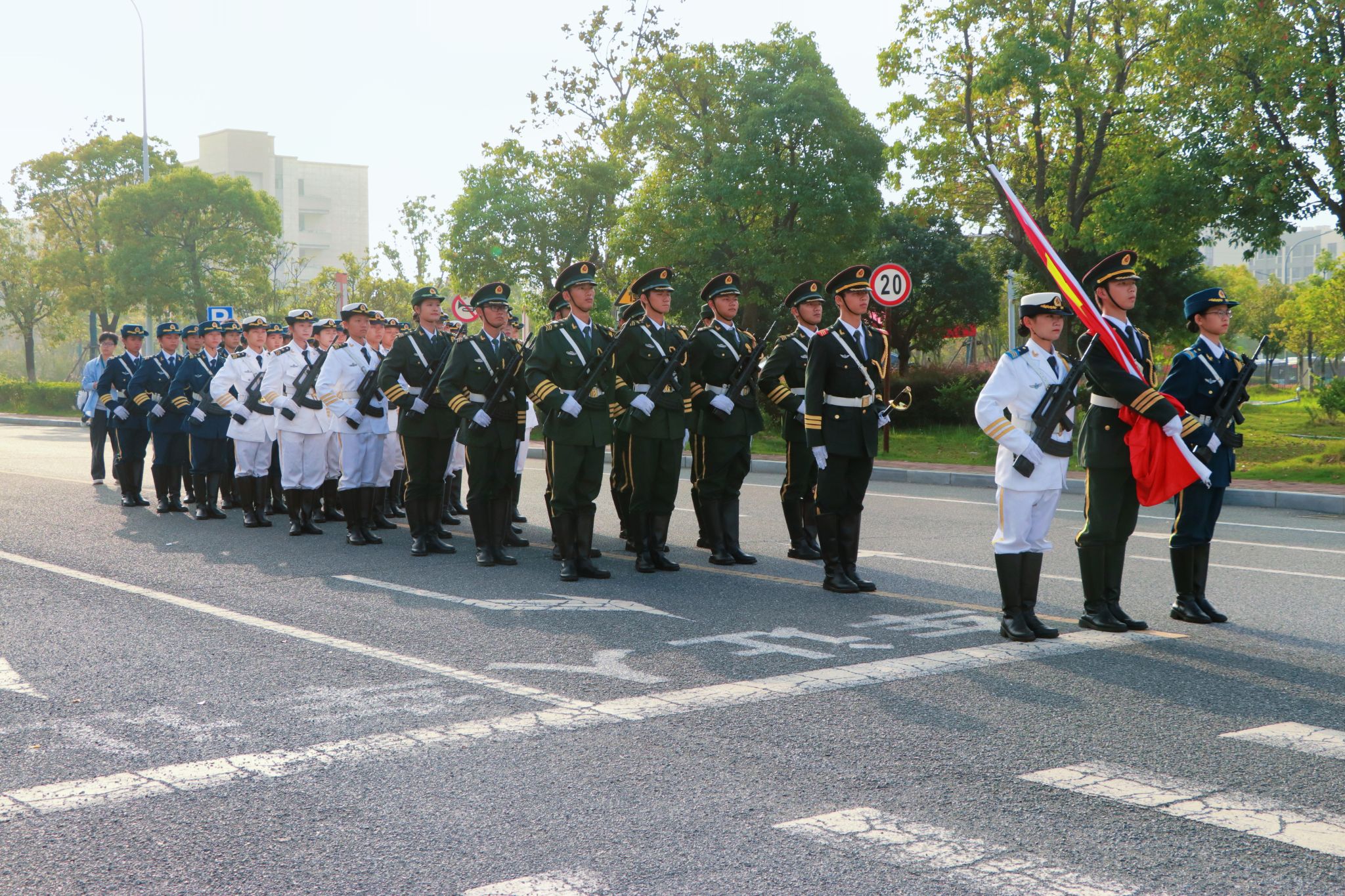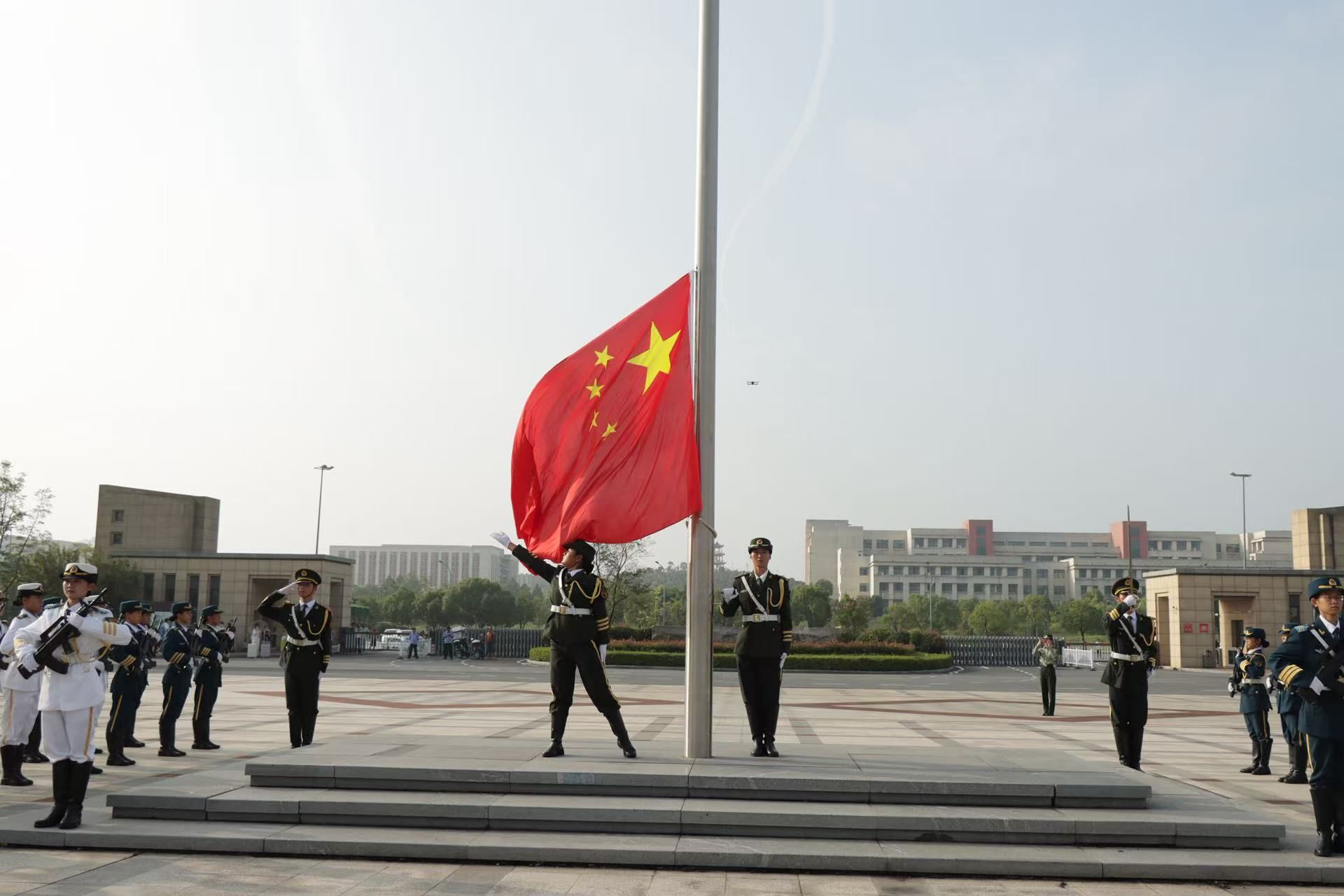上午八时整,《中国人民解放军进行曲》激昂响起,升国旗仪式正式拉开帷幕。学院国旗护卫队队员身着整齐礼服,英姿飒爽,眼神坚定。随着“请国旗入场!”的庄重口令,护旗队员迈着铿锵有力的步伐,动作整齐划一,昂首护卫着五星红旗正步走向升旗台。立定、转体、交旗,每一个动作都精准利落、庄重规范。