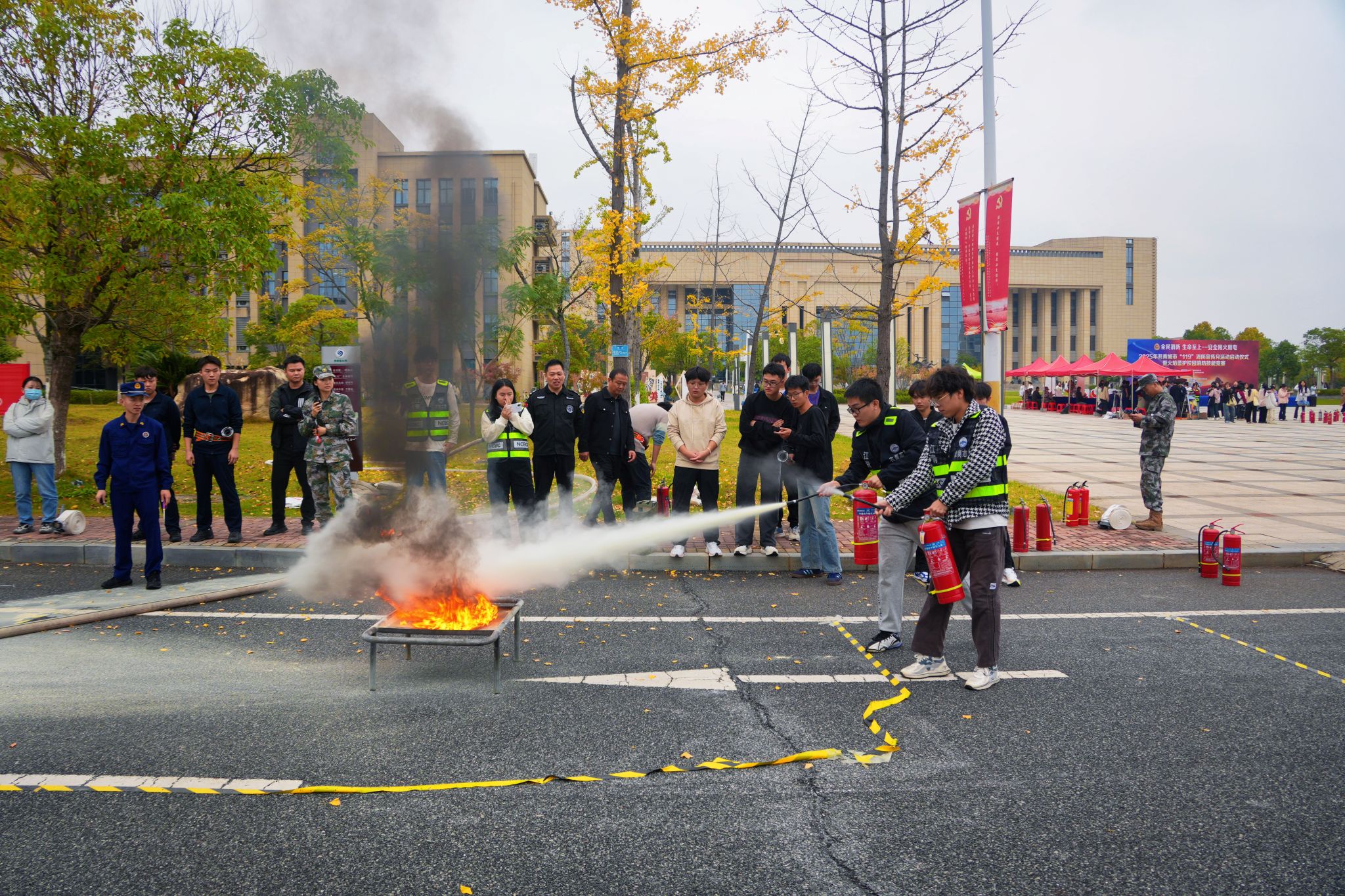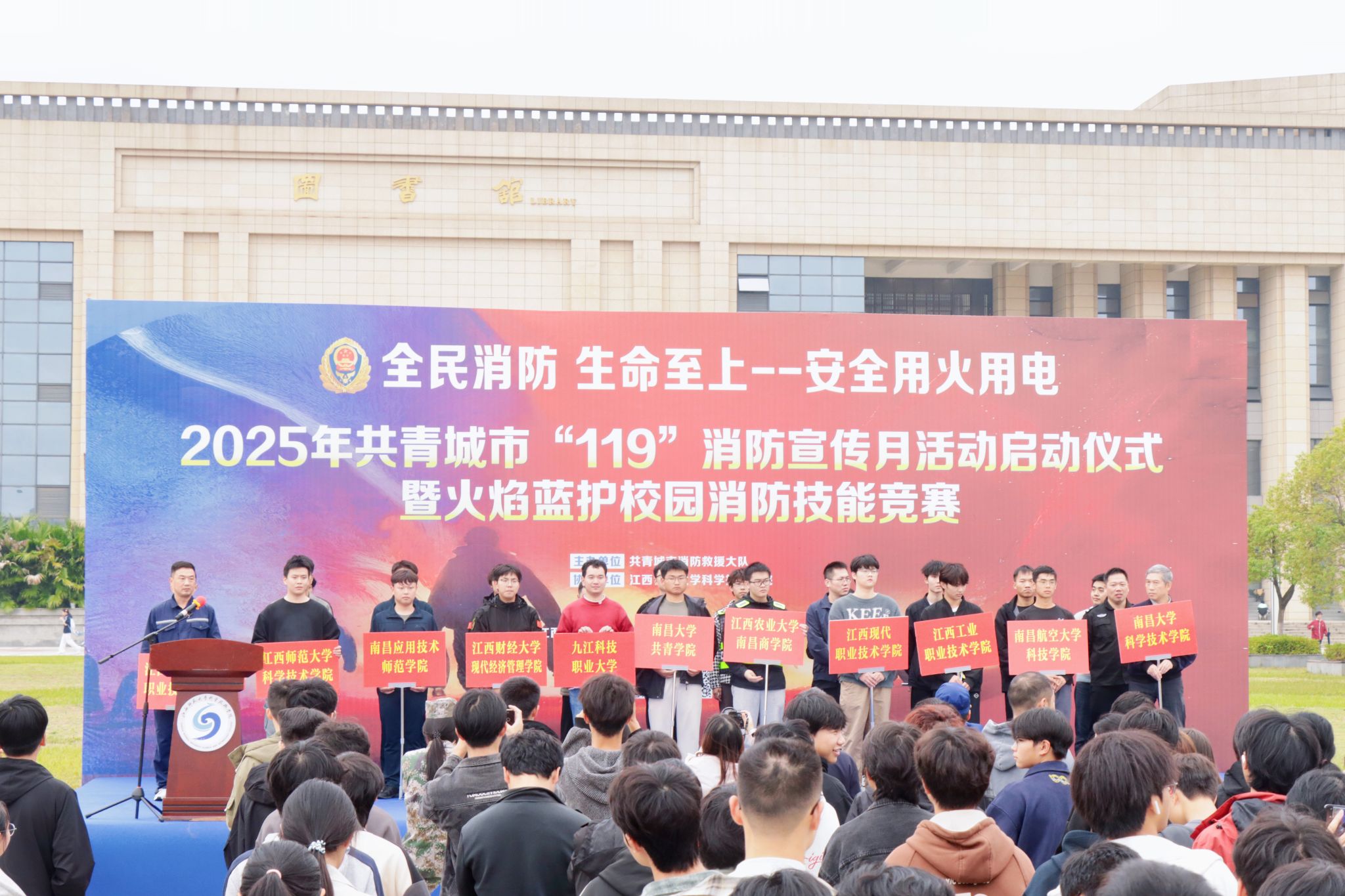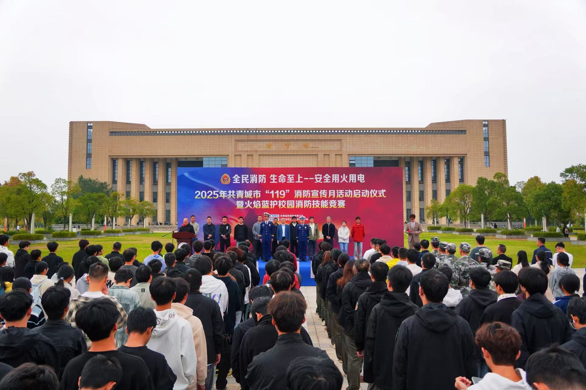 11月6日上午,2025年共青城市“119”消防宣传月启动仪式暨高校消防技能竞赛在我院举行。共青城市消防救援大队大队长吴文峰,我院党委书记黄小兵、纪委书记胡鹏出席活动,全市11所高校代表队及师生代表共400余人参加。