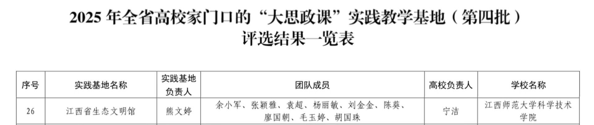 12月3日,江西省教育厅公布2025年全省“大思政课”建设综合改革试验区改革项目评选结果,学院获批全省高校“一课多师”示范团队一项、全省高校家门口的“大思政课”实践教学基地一项。