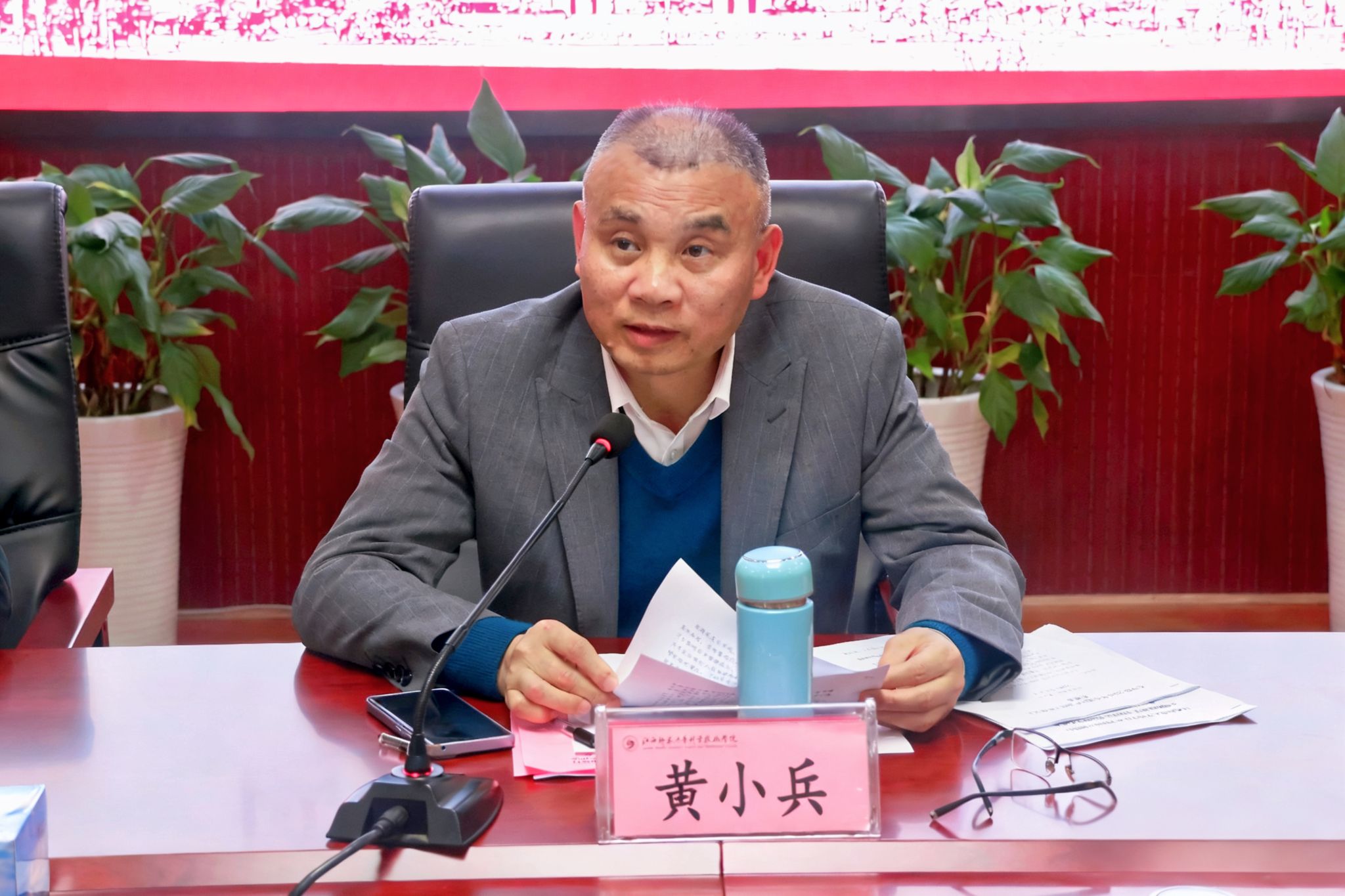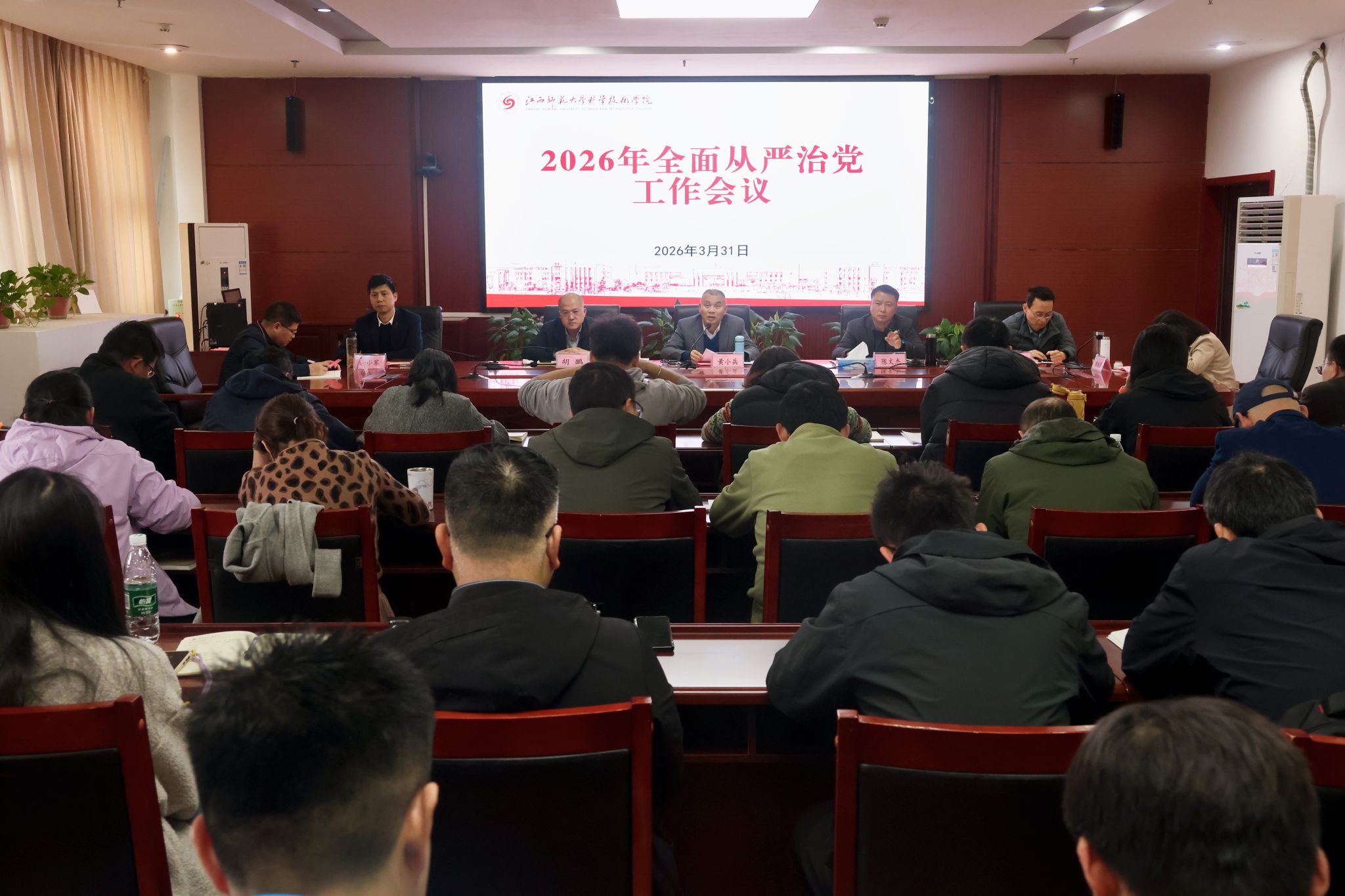 3月31日下午,学院在知行楼第二会议室召开2026年全面从严治党工作会议。学院在家党政班子成员出席,各单位各部门党政主要负责人、院纪委委员、各党支部书记参加会议。院党委书记黄小兵讲话,院党委副书记陈文杰主持,院党委委员、纪委书记胡鹏作工作报告。