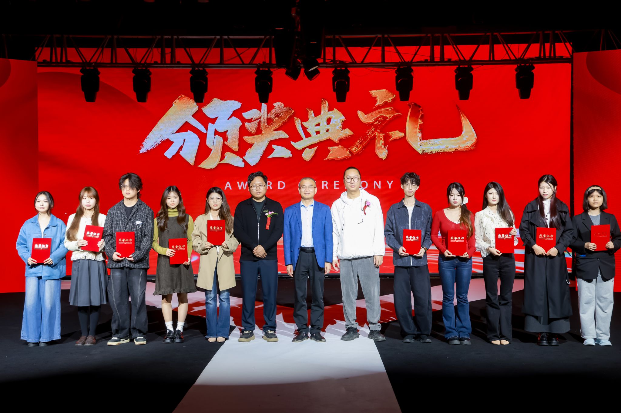 黄小兵与相关企业负责人共同为“十佳服装设计作品”获奖学生颁奖。