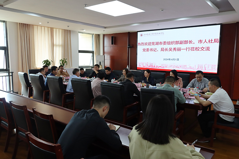 4月1日上午,安徽省芜湖市委组织部副部长、人力资源和社会保障局党委书记、局长吴秀丽一行来院考察交流。我院院长宁洁、党委书记肖接增,副院长赖经洪、陈志丹等一同会见客人,并出席校地合作交流座谈会。校地有关部门负责人参加考察交流活动。赖经洪主持座谈会。