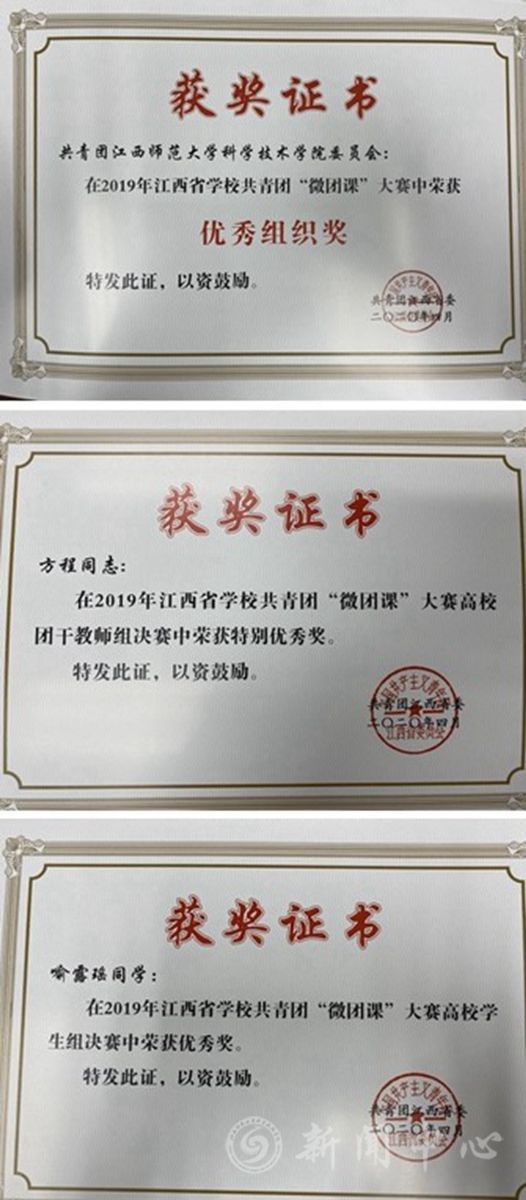 近日,团省委下发《关于 2019 年江西省学校共青团“微团课” 大赛获奖情况的通报》,我院团委获大赛优秀组织奖,青年教师方程获特别优秀奖,外国语学院2017级英语2班喻露瑶同学获优秀奖。