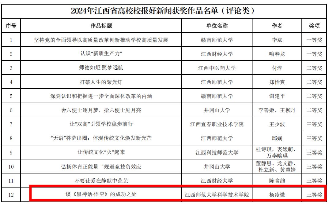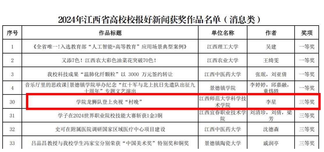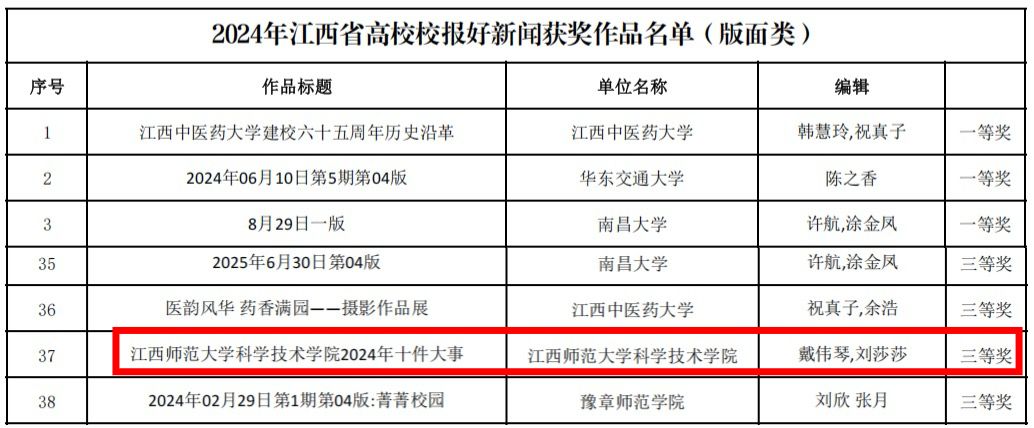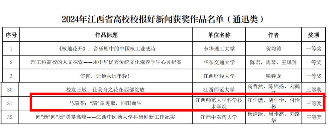 在消息类评选中,我院作品《学院龙狮队登上央视“村晚”》荣获三等奖;在通讯类评选中,作品《马瑞冬:“瑞”意进取,向阳而生》获得三等奖;在评论类评选中,作品《谈〈黑神话·悟空〉的成功之处》获得三等奖;在副刊类评选中,作品《这封信写给过去的自己》获得三等奖;在版面类评选中,作品《江西师范大学科学技术学院2024年十件大事》获得三等奖。